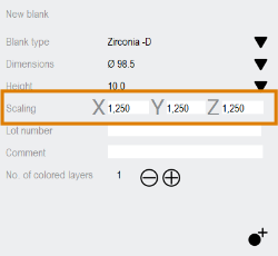 - Enter the material specific scaling factor into the Scaling input field. It is published by the manufacturer of the blank.