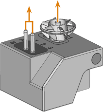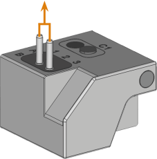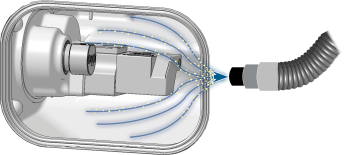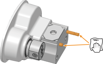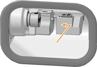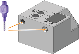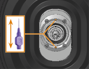 - Reinigen Sie die 2 gegenüberliegenden Öffnungen (orange markiert) in der Düsenplatte mit der Interdentalbürste. Bewegen Sie die Bürste dabei auf und ab.