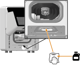 Reinigen Sie alle Flächen und Spalten im Arbeitsraum gründlich mit dem feuchten Tuch. Verwenden Sie bei Bedarf einen milden Reiniger.