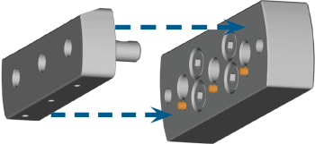 - La ayuda de posicionamiento del fijador de pilar (marcada en naranja) debe insertarse en la ranura de la pieza en bruto (marcada en azul).