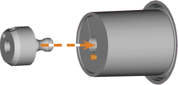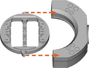 Introduzca el pilar Preform® en el soporte hasta que esté correctamente asentado. La base de la pieza en bruto debe apuntar con su parte plana (marcada en azul) hacia la ayuda de posicionamiento del soporte (marcada en naranja).