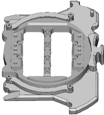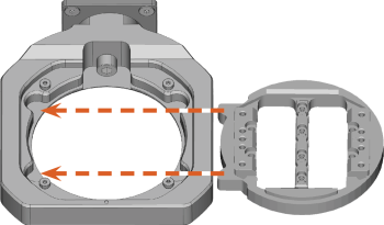- Afloje los 4 tornillos (marcados en naranja en la figura) que fijan el anillo de fijación al portapiezas.