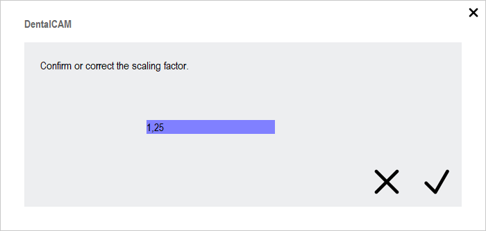 Une fois que vous ajoutez une nouvelle pièce brute à l’archive de pièces brutes, dentalcam exige pour certains types de pièces brutes la confirmation ou la correction du facteur d’échelle.