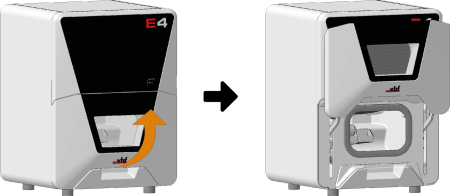 - Pour ouvrir ou fermer la porte de la chambre de travail, tirez-la vers le haut ou poussez-la vers le bas. Utilisez la poignée de préhension de la porte.