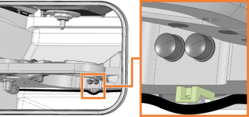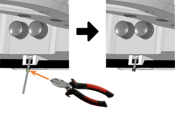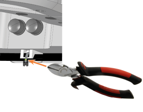 Coupez prudemment le serre-câble au niveau de la ligne de coupe (marquée en vert) à l'aide de la pince coupante. N'endommagez pas le câble de l'axe A lors de cette opération.
