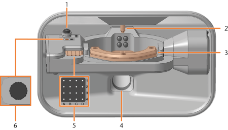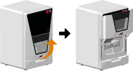 - Pour ouvrir ou fermer la porte de la chambre de travail, tirez-la vers le haut ou poussez-la vers le bas. Utilisez la poignée de préhension de la porte.