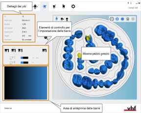 Ogni oggetto è circondato da un’area di lavoro, quindi è necessario impostare delle barre per tenerlo in posizione. dentalcam non calcolerà il job se ci sono oggetti senza barre.