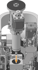 小心地将主轴单元向下推,注意主轴高度指示器。