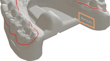 当某个牙弓模型的计算完成后,将以带底座和机器支承件的形式显示在 3D 视图中。修剪线将以红线显示。